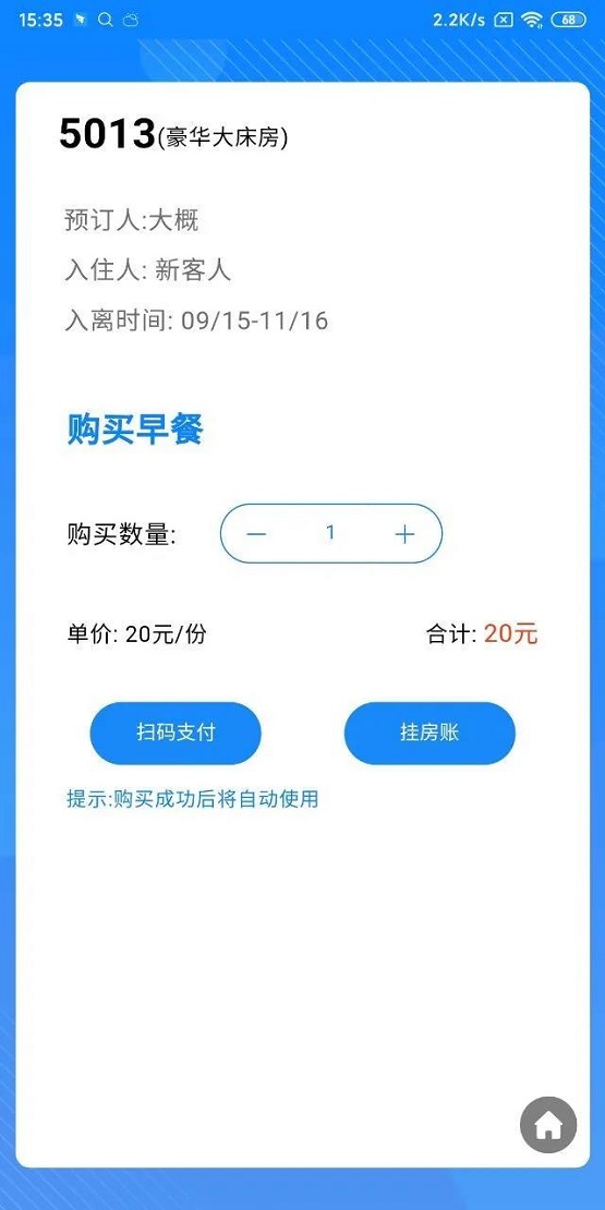 如果客人没有早餐,系统则会发出不含餐的提示音,并显示客人相关信息,提示餐厅员工进行引导询问客人是否需要购买早餐,如客人需要购买可直接在手机APP系统中完成,并且支持线上支付或房间挂账。