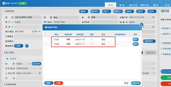 客人在酒店前台办理入住时,系统会按照正常流程制作房卡,通过系统在PMS端进行添加该房间实际用餐人数,无须再写早餐券等任何额外步骤,提高办理入住效率。