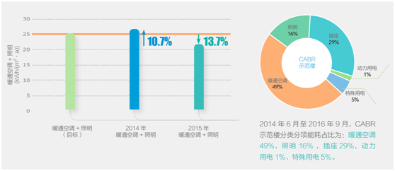 图2 CABR近零能耗示范楼2014-2016年能耗比对和分项占比