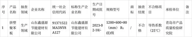 本次抽查发现山东鑫盛源节能建材有限公司生产的1批次产品不符合相关标准的要求,不合格项目为导热系数。
