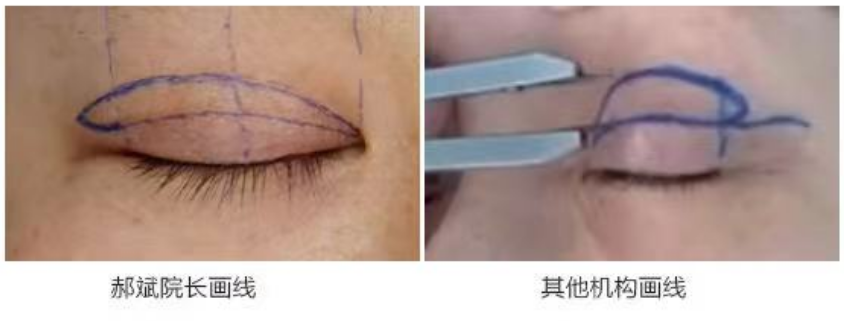 郝斌院长术前根据顾客职业、年龄、家族史、人群、地域、喜好等进行个性化定制,睁眼状态测量->闭眼测量->睫毛微翘测量->皮肤80%紧致状态测量->再睁眼核查测量5步分阶段测量,模拟不同状态下重睑状态,确定专属的美眼黄金分割点;采用0.25mm超细画线笔设计画线,相对于一般医生使用的1mm画线笔,避免粗线切开时产生的误差,更精细准确,双侧对称,弧度更流畅。