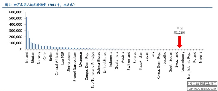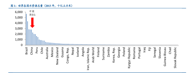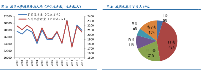 2013年我国水资源总量为2.8万亿立方米,居世界第五位,占世界总量6.5%;我国人均水资源量为2072立方米,排世界第102位,约为世界平均水平(6055立方米)1/3,被列为世界人均水资源最贫乏的国家之一。据统计,我国2013年劣V类水占比高达15%,水资源形势严峻。