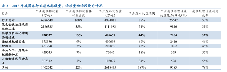 从行业统计上来看,我国2013年废水排放总量为629亿吨,其中黑色金属冶炼及压延加工业排放量最大218.6亿吨,占35%,其次是化学原料和化学制品制造业93亿吨,占15%