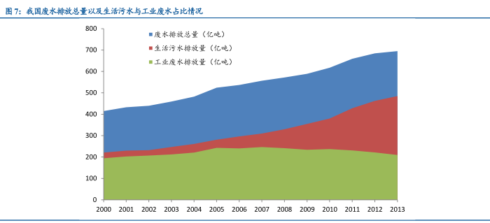 我国2013年废水排放总量为695.4亿吨,其中工业废水209.8亿吨,占30%,生活污水485.1亿吨,占70%。过去10年以来,工业废水排放量逐年下降,从2004年的221.1亿吨(占比46%)下降到2013年的209.8亿吨(占比30%),而生活污水排放量快速上升,从2004年的261.3亿吨(占比54%)上升到2013年的485.1亿吨(占比70%)