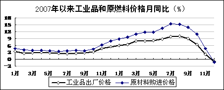 生产资料价格先扬后抑,四季度快速下滑。12月,流通环节生产资料价格环比下降3.7%,降幅比上月减少6.1个百分点;同比下降11.7%,降幅比上月扩大5.3个百分点。工业品出厂价格同比下降1.1%;原材料、燃料、动力价格下降1.3%。