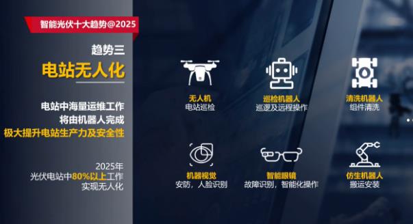 智能光伏十大趋势为:全面数字化、AI驱动智能升级、电站无人化、主动支撑电网、光储共生、虚拟电站、重构极致安全、高频高密、模块化设计、安全可信。