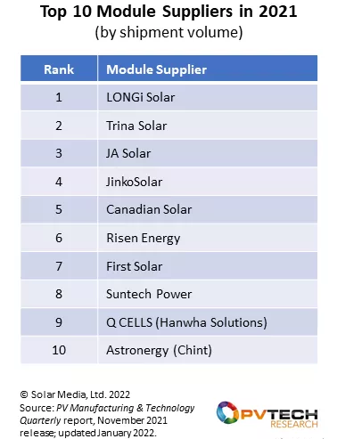 2021年,前10名的出货总量接近150GW。如果有人仍认为整个行业的规模在140-160GW的话(就像最近第三方机构的许多错误预测值告诉我们的那样),那么请再考虑一下。