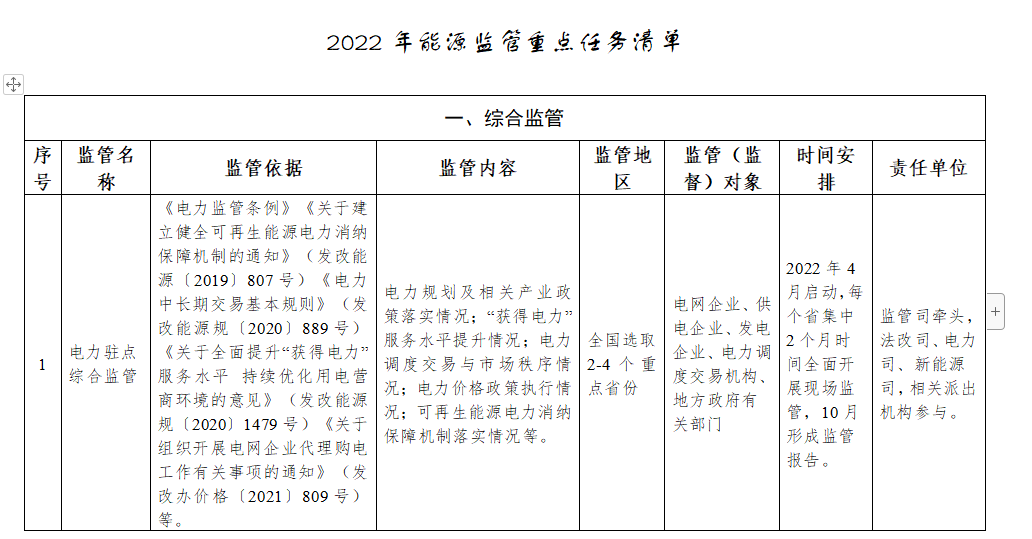 近日,官网发布关于印发《2022年重点任务清单》的通知,主要包含国家“十四五”能源规划重点任务年度落实情况专项监管、第一批以沙漠、戈壁、荒漠地区为重点的大型风电光伏基地建设情况专项监管、