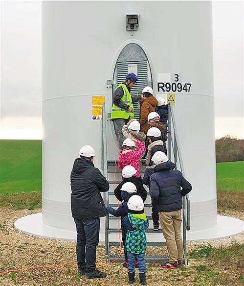 带着这些问题,在经过安全培训后,孩子们来到了风电场实地探索。他们身穿安全背心和安全帽进入风机内部,探索这些庞然大物的内部秘密。夏尔蒙风电场属于欧洲典型特点的分布式风电项目,该风电场现运行风机6台,轮毂高度81米,叶尖高度127米,装机容量12兆瓦,于2010年5月份投运,可为5500户家庭供电。