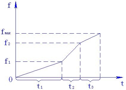 整个加、减速过程分为三段,f1、f2可以在0~fmax之间任意设定,t1 、t2、t3可以在0~3600之间任意设定。