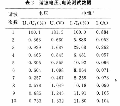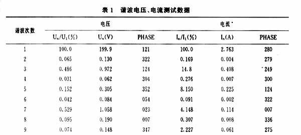 为了了解系统谐波情况,在低压母线上仅有3台电动机的运行工况时,进行了谐波测试与分析,为便于比较,将测试数据列于表1。