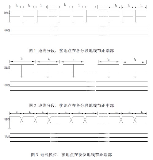 为限制绝缘架空地线的感应电压,采取的技术措施包括架空地线分段、地线换位等方法,各方案的工作原理如图1-图3所示:
