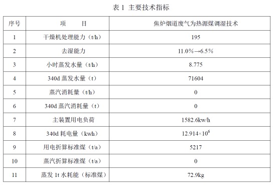 节能改造前用能情况:改造前炼焦入炉煤年平均水分:10.5%-13.5%,这些水分通过燃烧焦炉加热煤气提供的热量在炭化室内干燥蒸发,随荒煤气在上升管、集气管内通过喷洒大量的氨水进行冷凝、送废水处理工序进行处理,因此耗能较多。煤料水分每蒸发1个百分点,炼焦耗热量相应增加62.0MJ/t(干煤)。节能改造内容:为满足4座7.0m焦炉(年焦炭产能220万t)生产用煤需要,建设2系以焦炉烟道气为热源的炼焦煤调湿装置(每系设备处理能力195t/h)。采用煤调湿风选技术后,每年可节省能源36116吨标准煤。节能改造投资额:13000万元,每年可创效益5016万元,静态投资回收期:6.38年