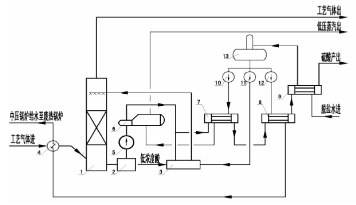 矿或冶炼气制酸低温回收技术是通过提高吸收工序的循环酸温,用高温浓硫酸在蒸汽发生器中产生低压蒸汽的能量回收技术。低温回收的方法是在硫酸装置第一吸收塔前并联一台热回收塔,通过大幅度提高循环酸温度,以蒸汽发生器代替酸冷却器产生低压蒸汽,并在蒸汽发生器出口设置了蒸发器给水加热器、废热锅炉给水加热器和脱盐水加热器以进一步利用低温回收装置产酸的热量,提高热回收率。在蒸汽发生器后专门设置了硫酸混合器,以便水与高温浓硫酸的充分混合。由于水与浓硫酸的反应十分剧烈,且因为水的加入腐蚀性特别严重,因此混合器的设计和材料的选择要求十分严格,既要保证加入的水能够分散均匀,又要求在高温下有很好的耐腐蚀性能。