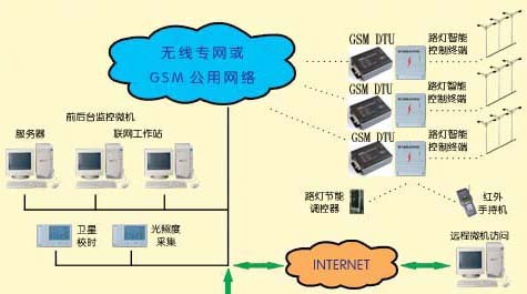 路灯监控系统主要是在线路终端配置了GSM/GPRS传输模块,根据实际情况的不同,GPRS模块的安装位置不同。